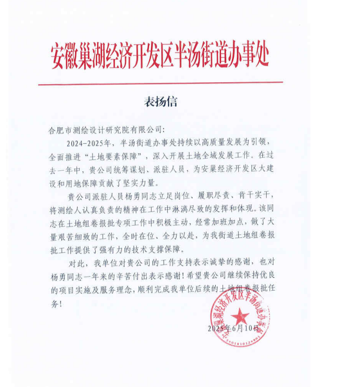 在半汤街道全面推进 “土地要素保障”、深入开展土地全域发展的关键时期,我司积极响应,统筹谋划,派驻专业人员为安巢经济开发区的建设及用地保障倾力服务。信中专门提到杨勇同志作为我司驻点工作人员,立足岗位、履职尽责,以测绘人认真负责的精神全身心投入到工作中。积极主动,经常加班加点,不辞辛劳地做着大量艰苦细致的工作,全时在位、全力以赴,为街道的土地组卷报批工作提供了坚实有力的技术支撑保障。