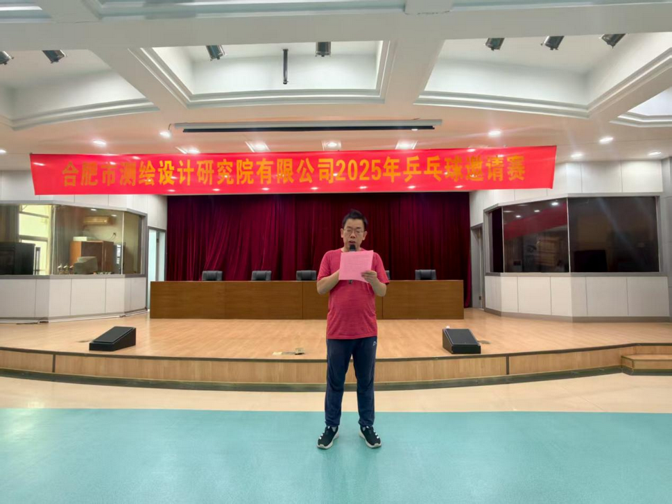 赵俊齐代表公司全体干部职工,向莅临现场的各位领导、嘉宾和客户单位代表表示热烈欢迎和衷心感谢。他指出,七十年砥砺奋进,合肥测绘院每一次跨越都离不开社会各界的信任与支持;站在新的历史起点,全公司将继续秉持“专业、诚信、高效、团结”的企业精神,以更高质量的测绘地理信息服务回报客户、服务城市。他强调,乒乓球是“国球”,更是友谊的桥梁,不仅承载着拼搏进取的体育精神,更象征着团结协作、互利共赢的合作理念。希望通过此次比赛,进一步加深与各单位之间的友谊,推动未来更深层次的合作与交流。希望大家在比赛中赛出风格、赛出水平、赛出友谊,并预祝赛事圆满成功。