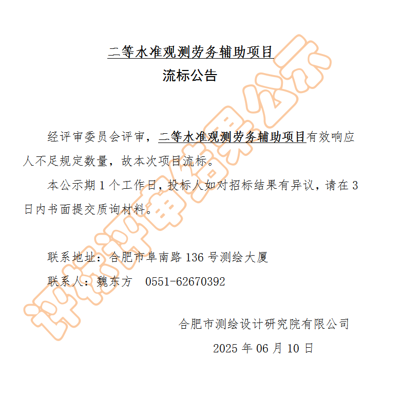 信息管理部01 采购信息公告 2025年6月10日 点击数:904 二等水准观测劳务辅助项目流标公告 上一篇文章: 地图印刷服务专业分包项目评标结果公示 上一页 下一篇文章: 地图印刷服务专业分包询价公告 下一页