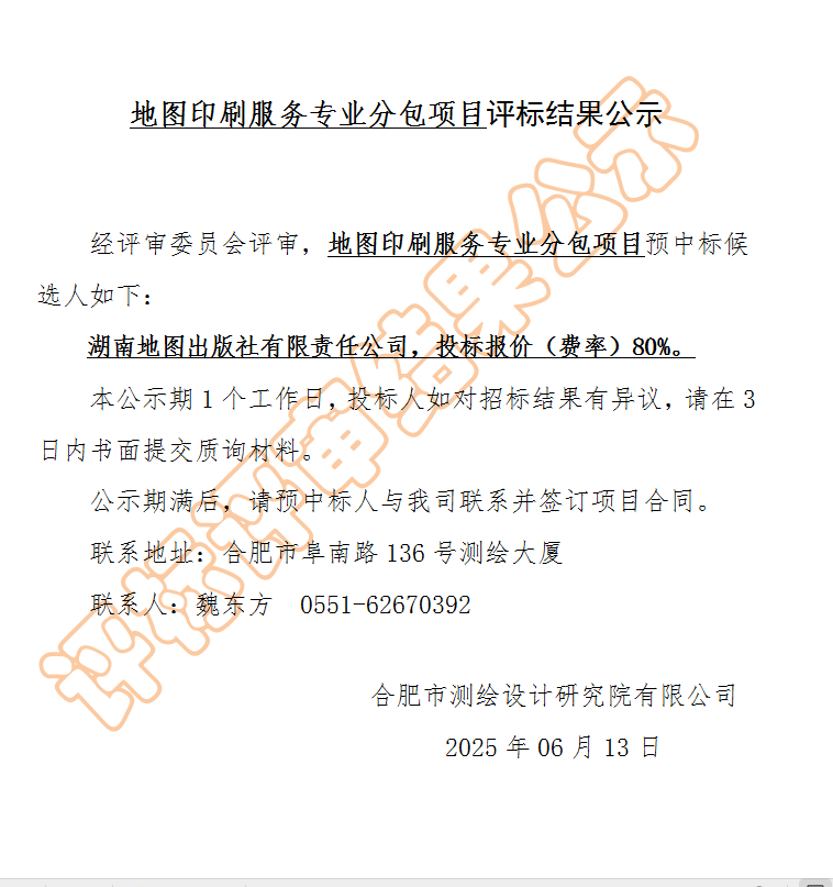 信息管理部01 采购信息公告 2025年6月13日 点击数:850 地图印刷服务专业分包项目评标结果公示 上一篇文章: 合肥市测绘设计研究院有限公司部分固定资产报废处置项目评标结果公示 上一页 下一篇文章: 二等水准观测劳务辅助项目流标公告 下一页