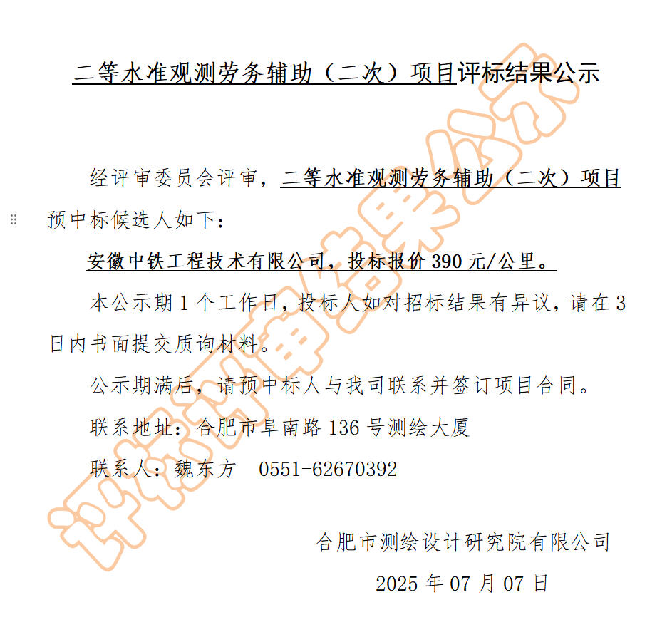 信息管理部01 采购信息公告 2025年7月07日 点击数:772 二等水准观测劳务辅助(二次)项目评标结果公示 上一篇文章: 合肥市测绘设计研究院有限公司2025年等级保护测评项目询价公告 上一页 下一篇文章: 2025年职工春秋游暨团建活动询价 结果公示 下一页